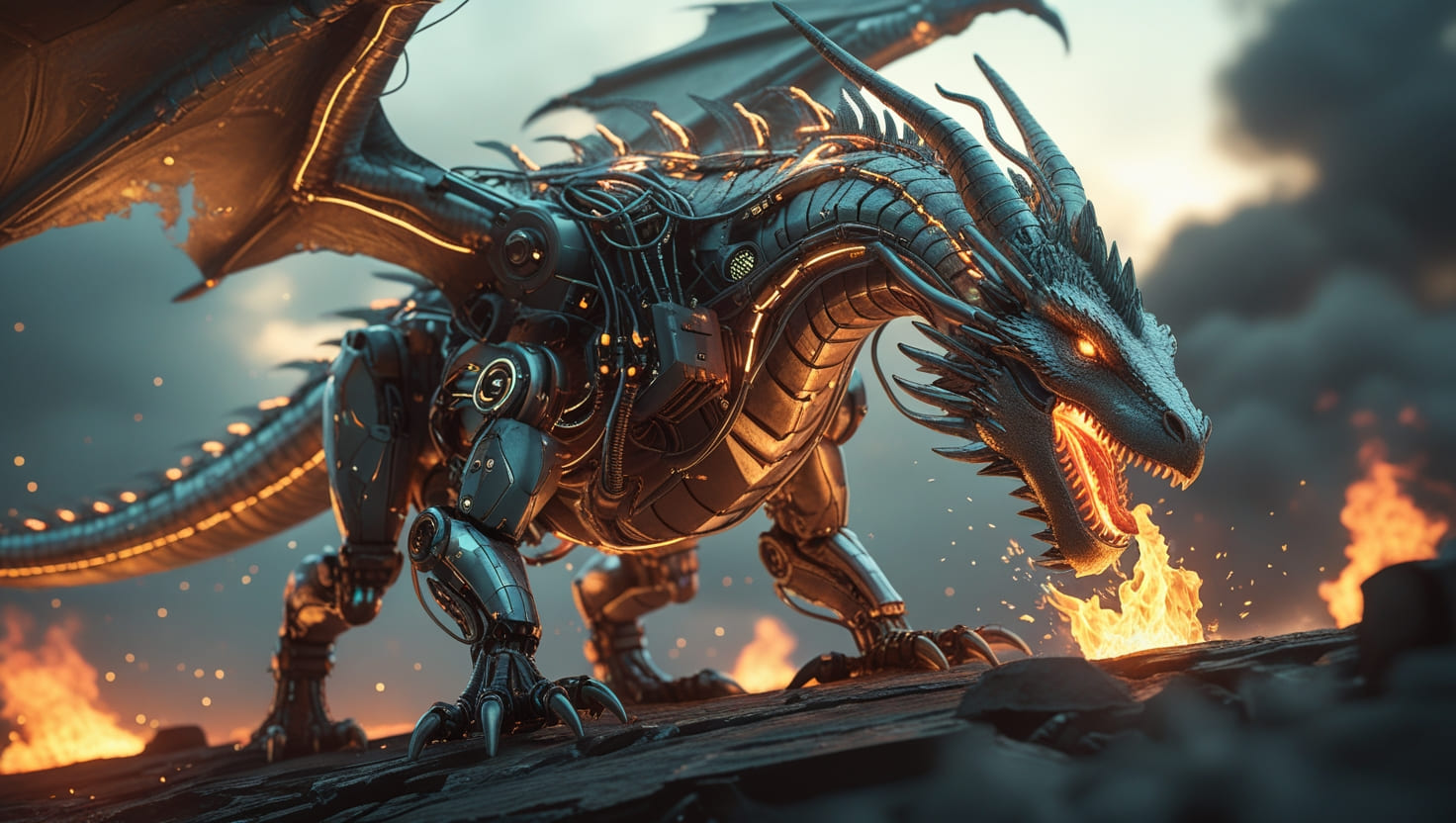 Image generative prompt ideas like this bring a unique fusion of sci-fi and fantasy to life. This prompt envisions a colossal biomechanical dragon, its body covered in metallic scales that shimmer with molten heat. Flames erupt from its jaws, illuminating the desolate ruins of a once-thriving city. Sparks crackle around its cybernetic joints, and its wings, made of reinforced alloy, pulse with a fiery glow. The atmosphere is thick with smoke, embers swirling in the air, creating a dramatic and intense setting. The detailed texturing and cinematic lighting enhance the depth, making the dragon feel larger than life.