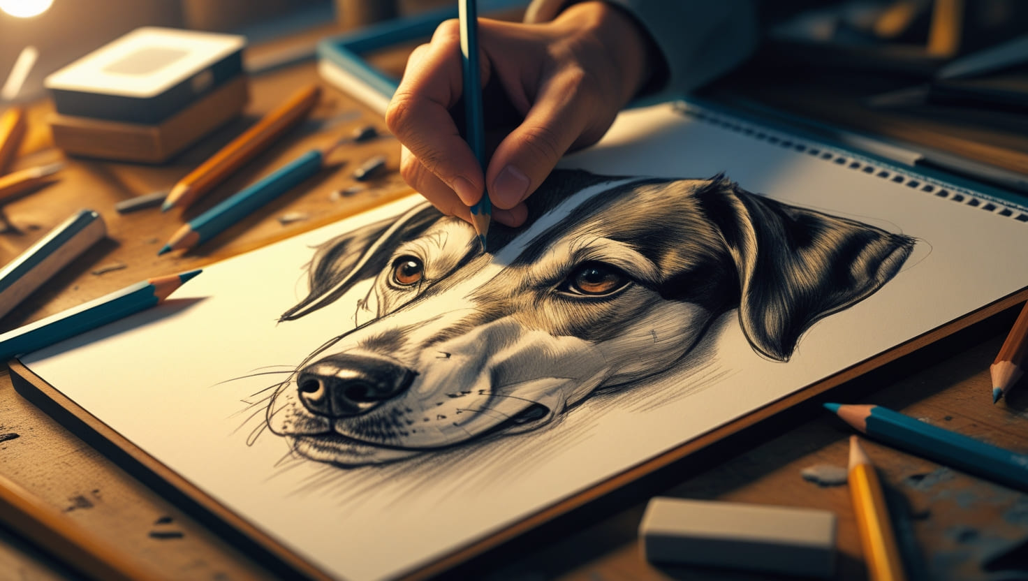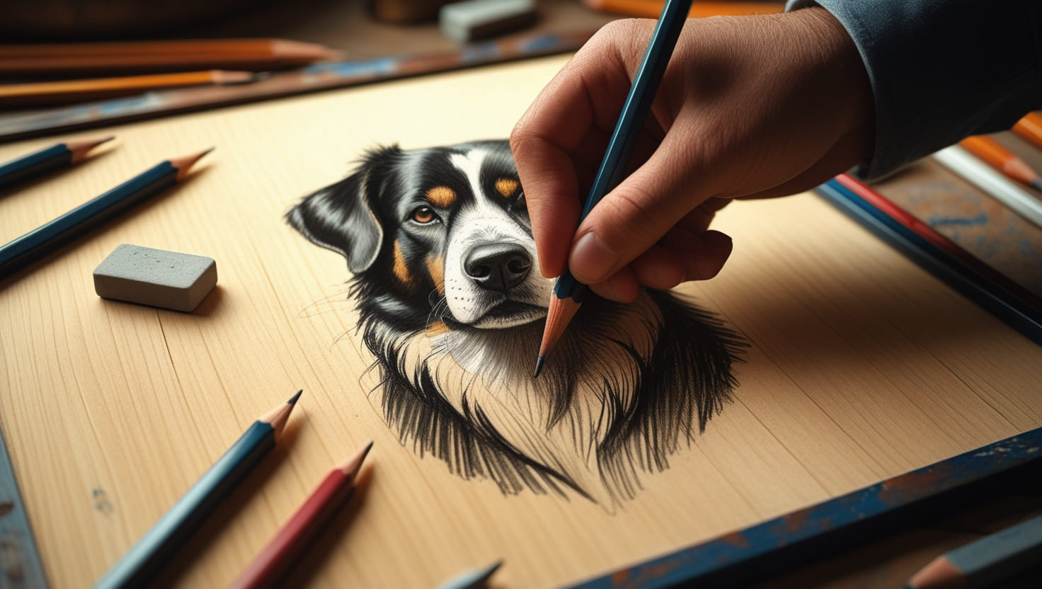 An AI-generated sketch-in-progress captures the essence of traditional artistry blended with modern creativity. A skilled hand is seen drawing a lifelike dog portrait on a textured sketchboard, with fine pencil strokes bringing depth and emotion to the artwork. Scattered around the board, various pencils and shading tools create an authentic artistic environment, emphasizing the raw process of creation. The partially completed sketch adds a sense of anticipation, showcasing the transition from rough outlines to a finished masterpiece.